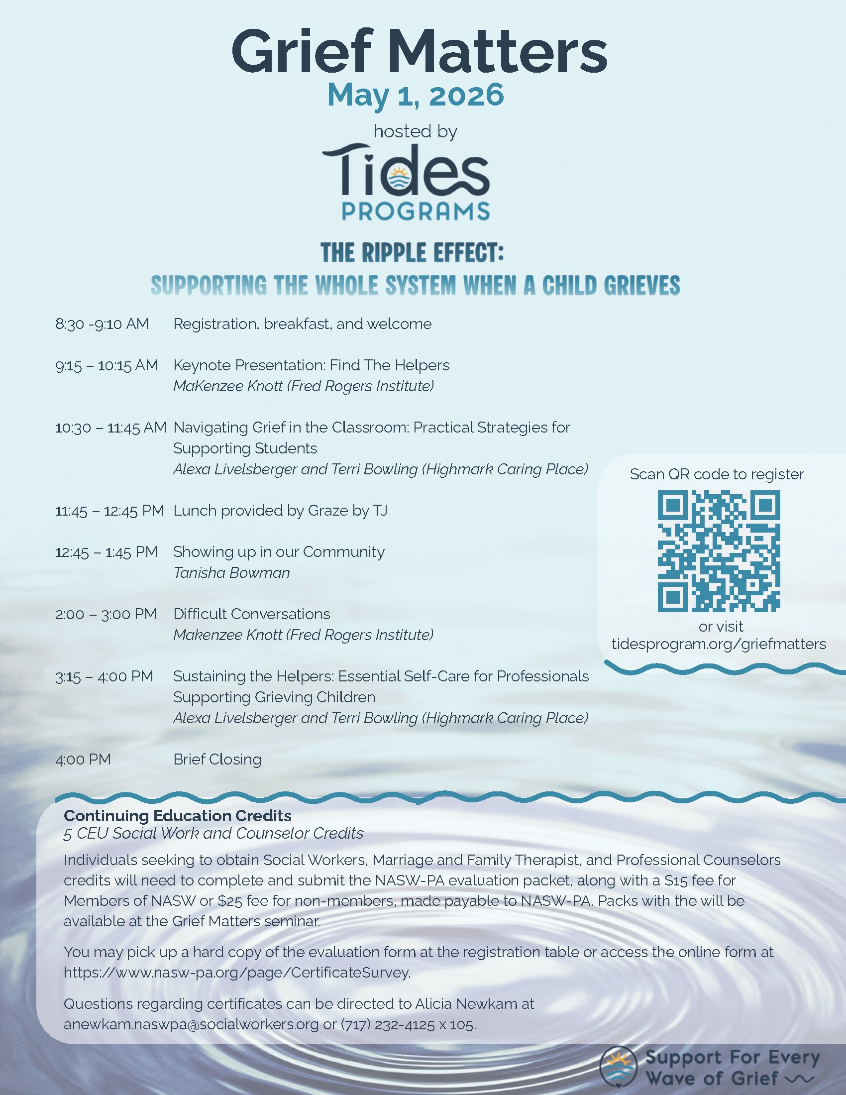 Join Tides at Grief Matters, a one-day educational seminar hosted by Tides. This year’s theme, The Ripple Effect: Supporting the Whole System When a Child Grieves, explores how grief impacts not just a child, but their family, school, and broader community. When a child experiences loss, the effects ripple outward. When we support the whole system, healing becomes more possible for everyone involved. Whether you work directly with children, support families, or are simply seeking to deepen your understanding of grief, we hope you’ll join us for this meaningful day.
